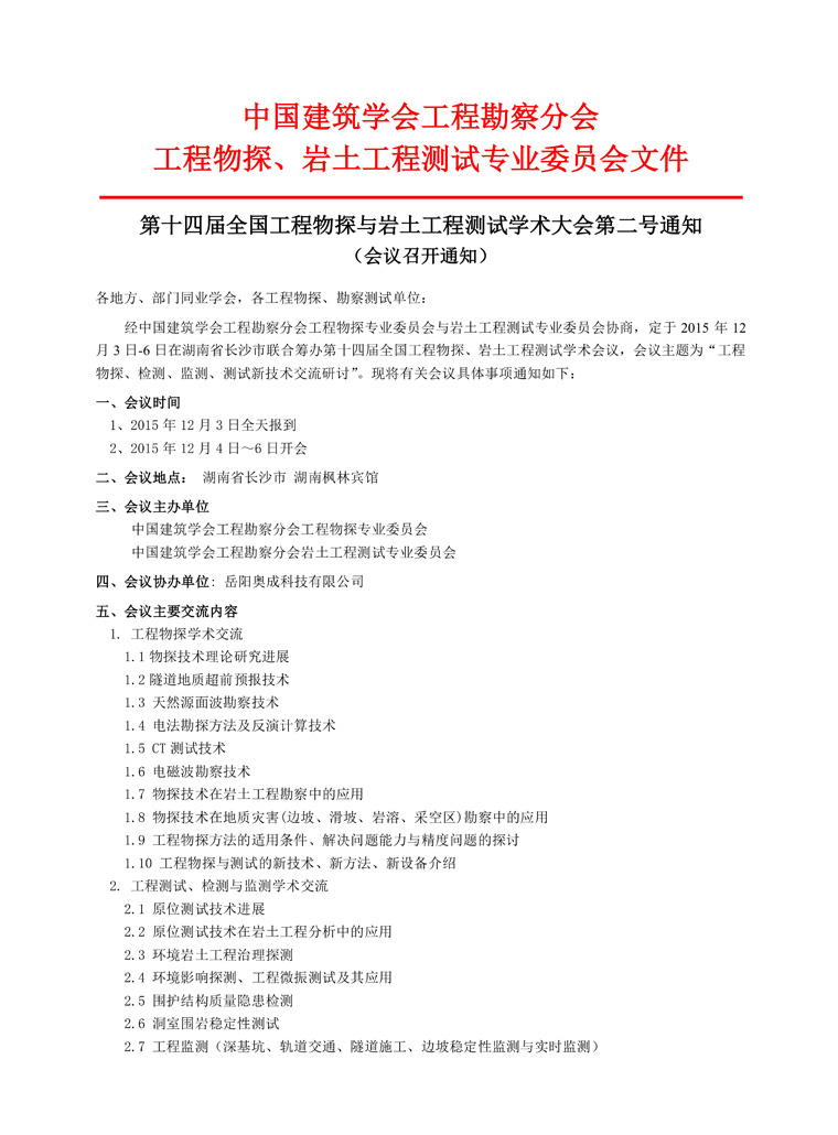 第十四屆全國(guó)工程物探與巖土工程測(cè)試學(xué)術(shù)大會(huì)第二號(hào)通知 (會(huì)議召開通知)