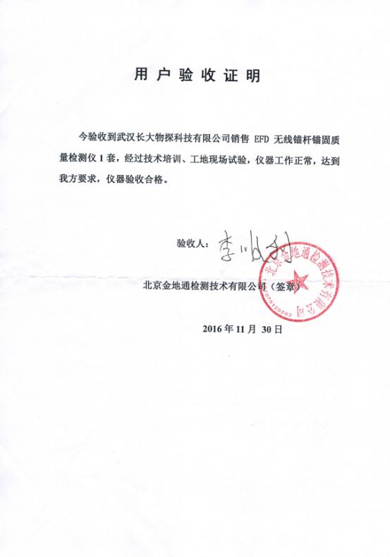 新聞網(wǎng)訊(通訊員:陳華) 熱烈祝賀北京金地通檢測(cè)技術(shù)有限公司通過詢價(jià)竟標(biāo)方式成功購買我公司EFD無線錨桿錨固質(zhì)量檢測(cè)儀。