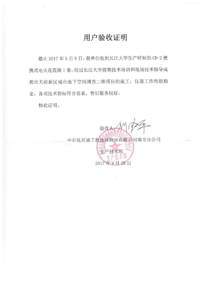 文章來源:武漢長大物探科技有限公司 發(fā)布日期:2017/9/28 瀏覽次數(shù): 次新聞網(wǎng)訊(通訊員:于東) 2017年7月31日—8月4日,中石化石油工程地球物理有限公司南方分公司(成都市雙流縣正興鎮(zhèn)大安村項目)購買我公司電火花震源。經(jīng)調(diào)研考察及工地現(xiàn)場試驗,我公司電火花震源在小丘陵及樹林等條件惡劣、環(huán)境復(fù)雜的工地現(xiàn)場使用效果良好,做出了較好的數(shù)據(jù),解決了實際問題,其效果得到了業(yè)主領(lǐng)導(dǎo)及項目組的高度肯定。