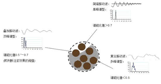 譜能比分析是通過計算具有張力的彈性材料振動譜主頻能量與材料賦存環(huán)境的總譜能量比值變化,研究其賦存環(huán)境狀態(tài)的解譯方法。預應力鋼絞線處于不同壓漿包裹狀態(tài)下的譜能比值